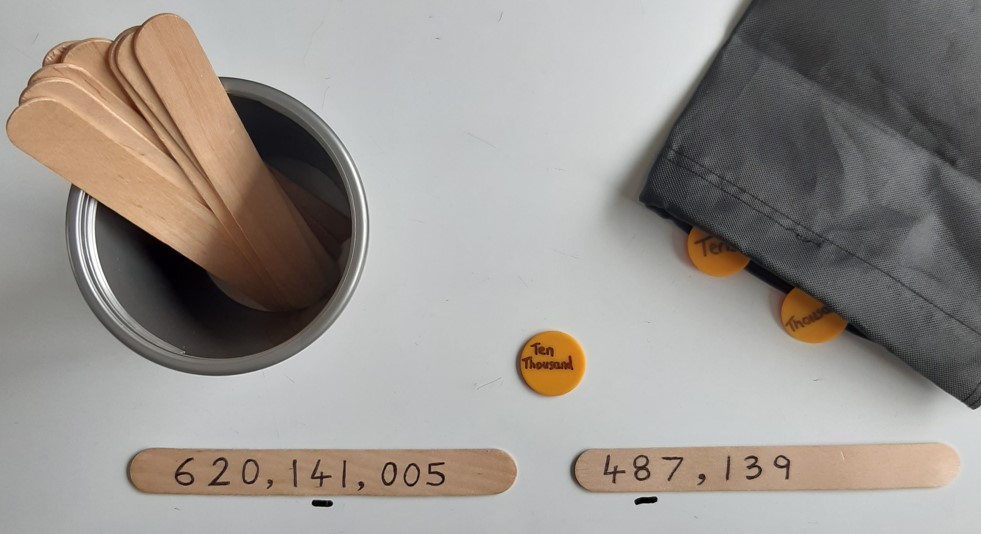 Each player picks a stick. One player then rolls the dice (or draws a counter from a bag) and each player checks the digit in that place on their stick. The person with the highest digit scores a point.