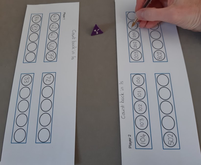 Decide on how to count (back in 1s, on in 2s etc) and record an appropriate starting number in the left most circle for each player. Players take turns to roll the dice and fill in that many circles, counting in the manner agreed. The recording sheet can be used vertically to make it easier to see patterns in the number sequence. The first person to fill in the final circle wins.